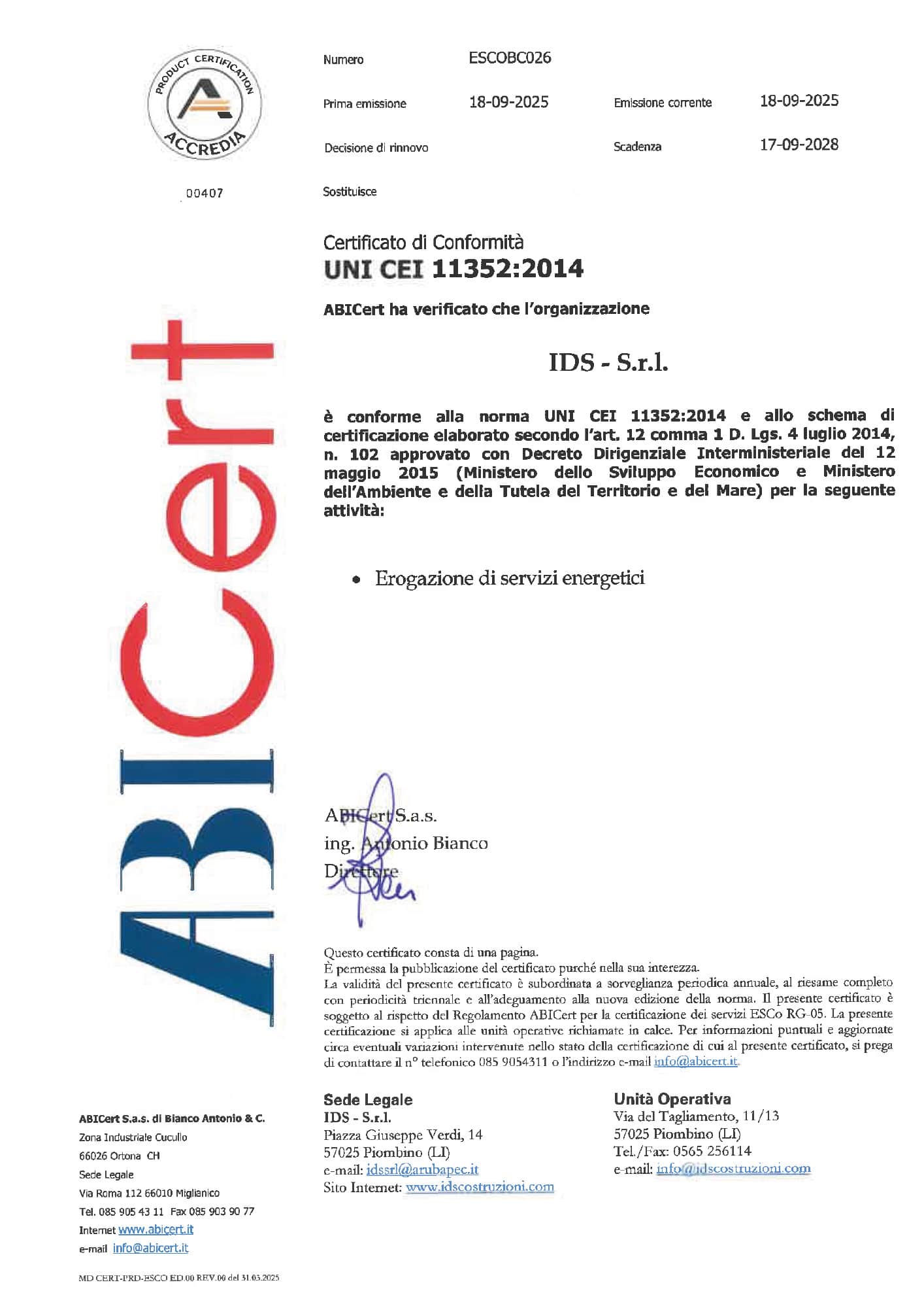 Con l’obiettivo di rispondere alle crescenti esigenze di efficienza energetica, IDS Srl ha intrapreso un importante percorso di evoluzione adottando il modello di Energy Service Company (ESCo). Questo passaggio strategico permette all’azienda di offrire soluzioni integrate per il miglioramento dell’efficienza energetica di edifici pubblici e privati, sfruttando tecnologie all’avanguardia come fotovoltaico, pompe di calore e sistemi di accumulo energetico.